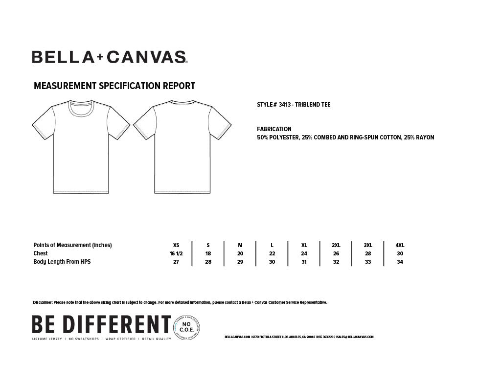 Product Description: Bella + Canvas Triblend Short Sleeve Tees. This tee is exceptionally soft and lightweight, proprietary triblend fabric, offering unparalleled smoothness and comfort. The Unisex Triblend Short Sleeve Tee is a casual basic with a luxurious look and feel, ready for any and all forms of customization.